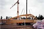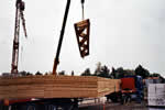 Der Dachbinder biegt sich unter seinem Eigengewicht. Mit Hilfe eines mobilen Krans werden die Dachbinder entladen und zwischengelagert.