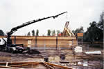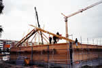 Der Polier der Fa. Groth setzt mit Hilfe des Spezialkrans die Verschalung für die Zwischendecke.
