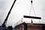 Das Stellen des Dachbinders übernimmt ein Spezialkran.