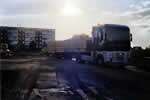 Die zwei Spezialtransporter warten auf das Entladen der Dachbinder.